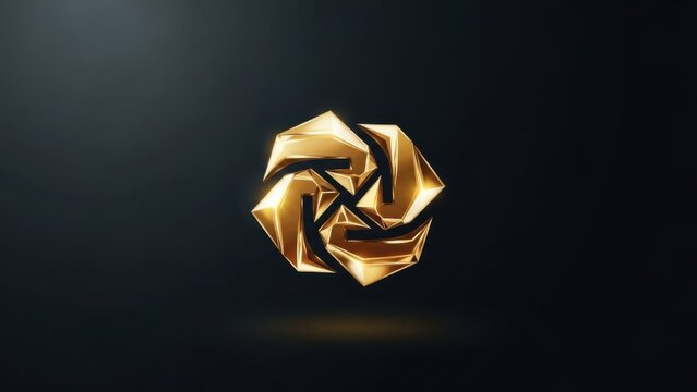 Luxurious faceted golden metallic symbol with a dynamic futuristic design glowing on dark background