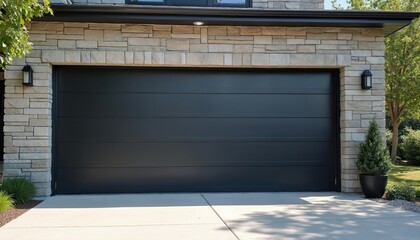 Modern black garage door design in a luxury home. Horizontal panels and stone facade offer protection, security. The closed door represents an urban style with metallic accents.