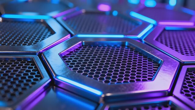 Close-up of hexagonal metallic grid illuminated with blue and purple neon lights