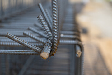 Rusty steel bars arranged in a grid pattern on a construction site during the early morning light