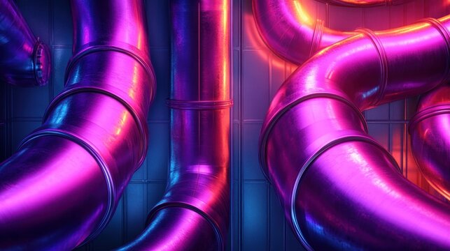 Shiny curved metallic pipes twisting and bending across a paneled metal wall bathed in neon magenta blue and orange light with glossy reflections and a futuristic energetic mood