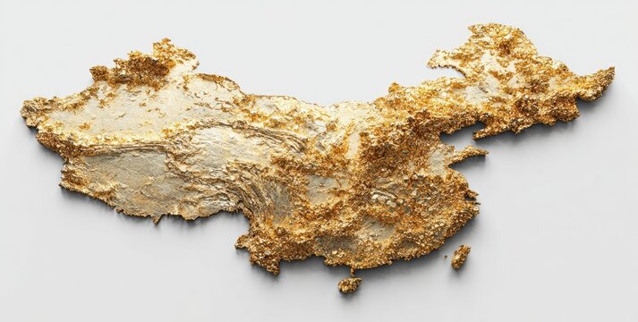 A three-dimensional, gold-colored topographical map of China, rendered with textured detail, sits against a plain white background