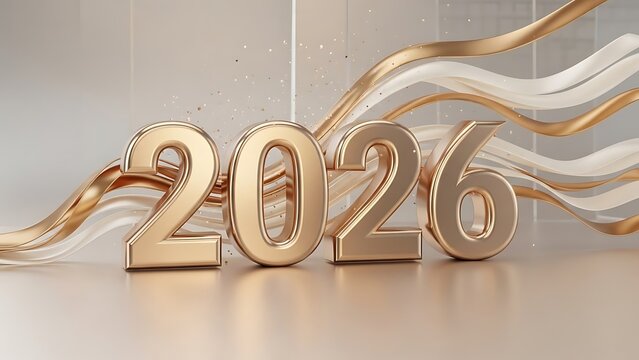 Golden 2026 numerals with flowing metallic ribbons on light background
