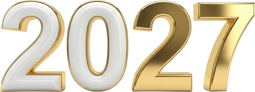 Gleaming 3D numerals depicting the year 2027 with a luxurious combination of white polished surfaces and metallic gold edging new year celebration future number rendering transparent background
