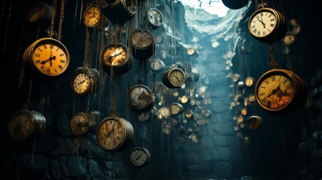 An array of suspended clocks evoke a sense of fleeting time and create a visually striking display