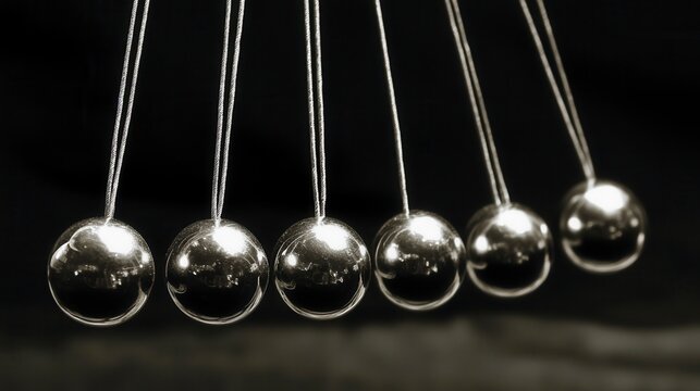Close-up of a Newton's cradle, showing five metallic spheres suspended by thin strings against a dark background.