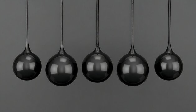 Five Glossy Black Spheres Suspended in a Row Against a Gray Background