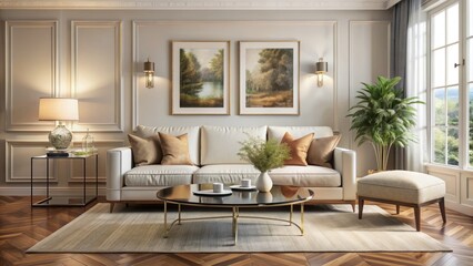 Elegant living room interior with cream sofa, glass coffee table, and large framed photo on a white wall background.