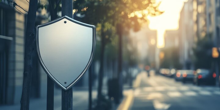 Urban Shield: Security and Protection in the City. A metallic shield emblem stands prominently on a city street, symbolizing safety, security, and urban protection. The warm.