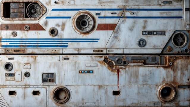 A close-up of a spaceship hull showing weathered metal panels with blue and red stripes