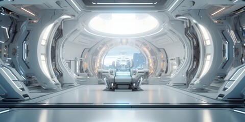 Space station or spaceship scifi style corridor or room. metallic feel and blue. Ultra modern sci-fi design