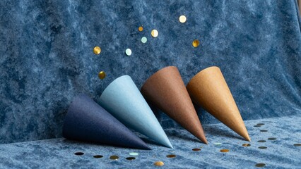 Silver embroidered happy new year text on luxurious blue velvet folds with metallic thread