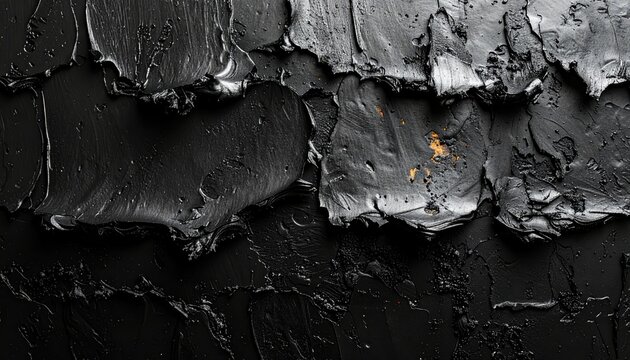 Extreme close up of thick impasto black oil paint texture with dramatic light showcasing heavy sculptural peaks and subtle metallic gold flecks highlighting deep artistic surface detail.