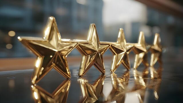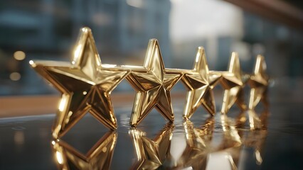 Row of shiny gold star trophies lined up on a reflective surface. Concept Gold star trophies, Row of awards, Reflective surface, Shiny metallic trophies, Award ceremony aesthetics