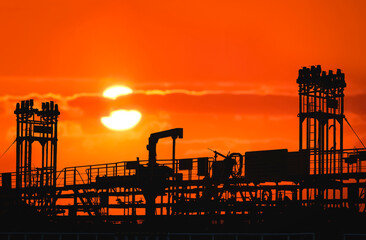 Silhouette pipelines system on crude oil tanker at harbor with blurred sunset sky background