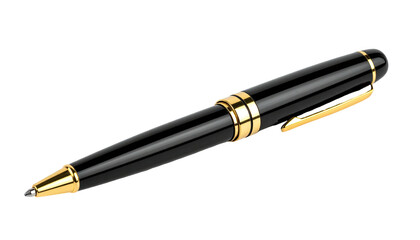 Glossy, black writing instrument with gold accents, clip, and tip, isolated on a stark black background