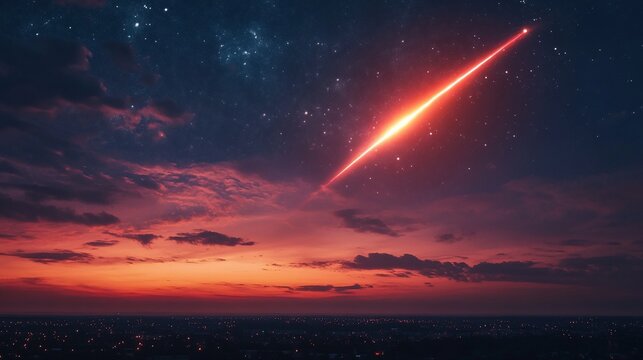 Fiery meteor streaks across a vibrant cosmos, illuminating clouds and rocky terrain