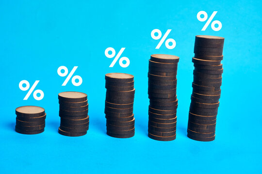 Stacked coins with percentage symbols illustrating compound interest growth and return on investment, representing financial accumulation and savings performance over time.