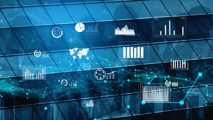 A modern representation of data visualization with various business graphs overlaying a glass building, illustrating the concept of analytics and digital growth in urban settings. Xenic