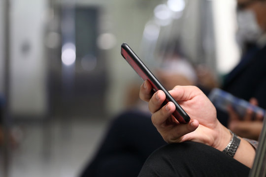 Hand of people holding cellphone while taking metro subway train to work with copy space