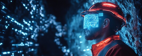 Closeup of a miner in a hightech underground mine, utilizing a neon blue holographic interface for realtime data and precise resource extraction