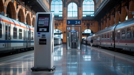 An automated biometric ticketing kiosk at a train station, featuring a user-friendly interface and quick biometric check-ins.