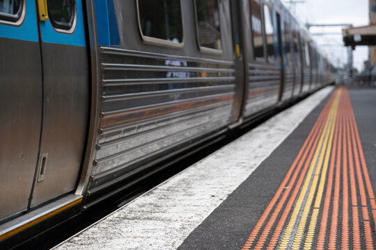 Railway station platform with yellow and red safety dots, and a departing PTV metro train in Melbourne, Australia. Focus on the dots in front and the doors at the left