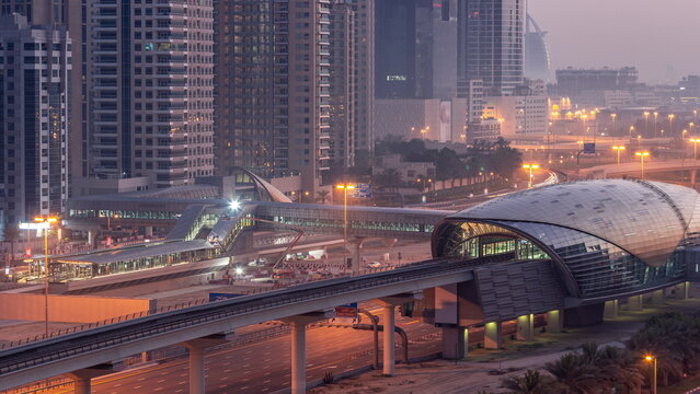 Futuristic building of Dubai metro station and luxury skyscrapers behind in Dubai Marina aerial night to day