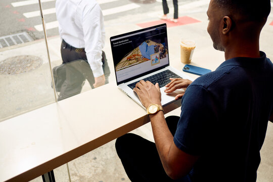 Man uses a laptop in downtown New York