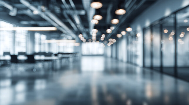 An aesthetic view of a modern office interior, blurred with focus on the hallway, showcasing the interior and design of the workspace.
