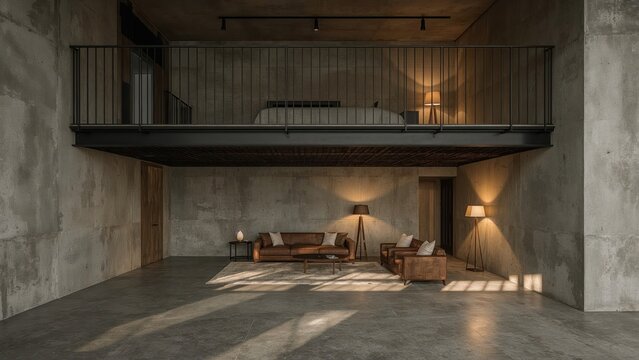 Modern loft apartment interior with concrete walls and mezzanine featuring living room area and bedroom design