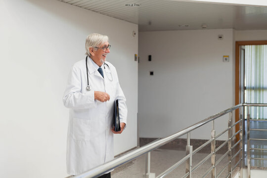 Senior male doctor standing and speaking in hospital corridor with lab coat, stethoscope, clipboard