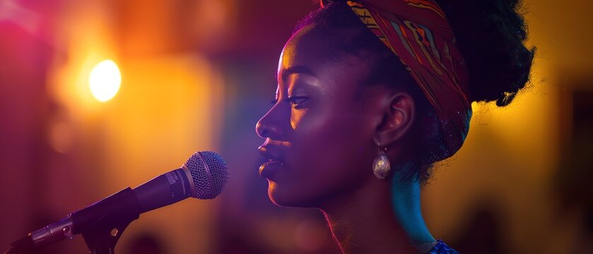 Soulful african american singer leaning into vintage microphone closeup warm portrait