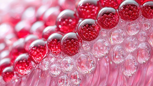 Red microbeads in transparent bubbles on pink surface, macro close-up