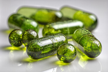 Close-up of glossy green supplement capsules and spherical gel beads with shimmering particles, representing herbal vitamins and modern nutraceuticals