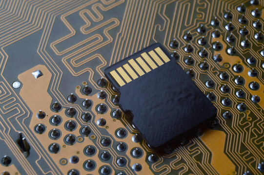 Motherboard, electronic circuit texture background. Hard disk macro photo