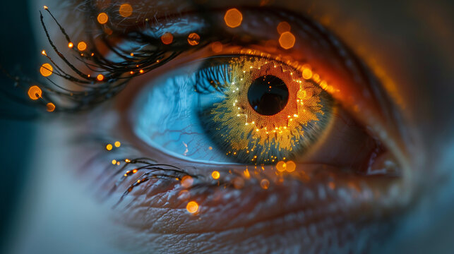 Female cybernetic eye with holographic hud overlays and neon blue augmented iris