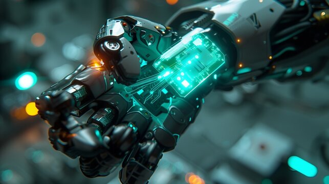 Close-Up of a Microchip Implant, Glowing Teal, Being Inserted into a Synthetic Human Arm