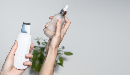 Female hands holding ultrasonic skin scrubber and beauty serum. Skincare electrical gadget for procedure at home. Copy space