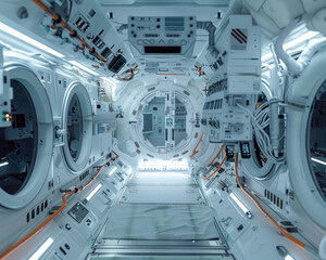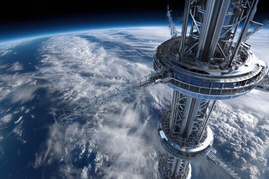 Exploring the advanced design of a space station orbiting Earth surrounded by clouds in a brilliant blue atmosphere
