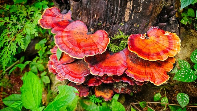 Close-up of Red fungi (microporus xanthopus) Beautiful wild mushrooms grow in clusters with bright green moss on twigs in a natural forest.