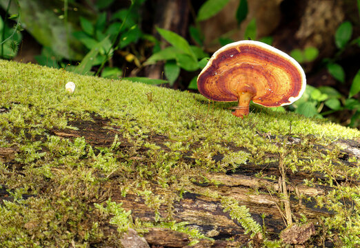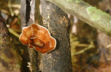 microporus xanthopus mushroom growing on decaying wood in the tropical forest