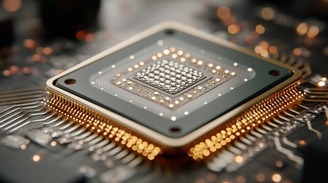 Close-up of a modern microprocessor on a circuit board with glowing connections and intricate details