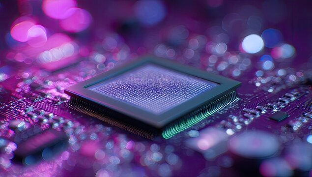 Close-up of a microprocessor chip on a circuit board, illuminated with vibrant pink and purple bokeh lights