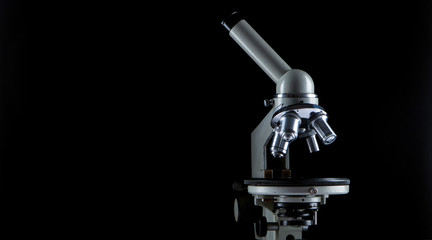 Laboratory lens of Microscope Isolated scientific research background, black and white.