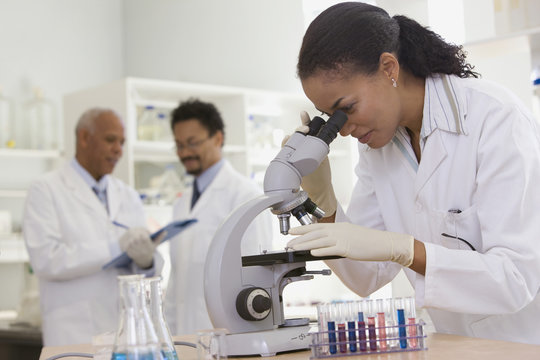 Young black scientist analyzing medical sample under the microscope while working with her colleague in lab.