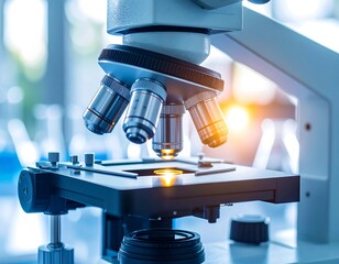 Close-up of a modern microscope in a lab setting.  Bright light illuminating the sample