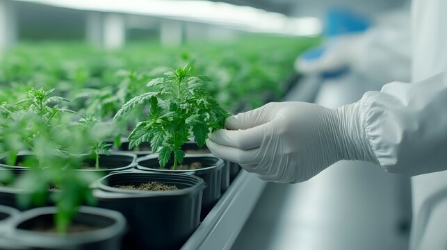 Scientist Carefully Handling Plant Samples in Biotechnology Lab for Agricultural Innovation