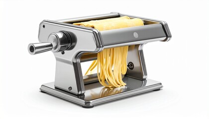 A realistic stainless steel pasta machine with crank handle and dough rollers isolated on white background