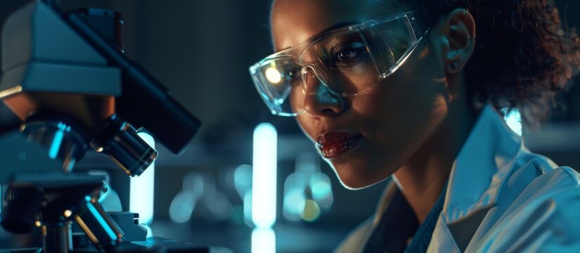 A female scientist is diligently researching in a lab, using a microscope for scientific exploration. She shows professionalism, dedication, and safety while handling lab equipment